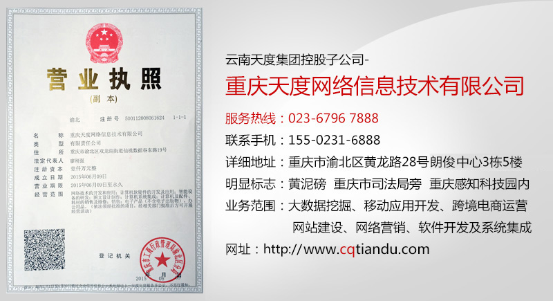 云南天度集團控股子公司-重慶天度網絡信息技術有限公司于2015年6月9日在重慶市渝北區(qū)注冊成立,主要從事大數據挖掘、移動應用開發(fā)、跨境電商運營、網站建設、網絡營銷、軟件開發(fā)及系統集成等業(yè)務。公司位于重慶市渝北區(qū)黃龍路28號朗俊中心3棟5樓(整層),服務熱線:023-6796 7888