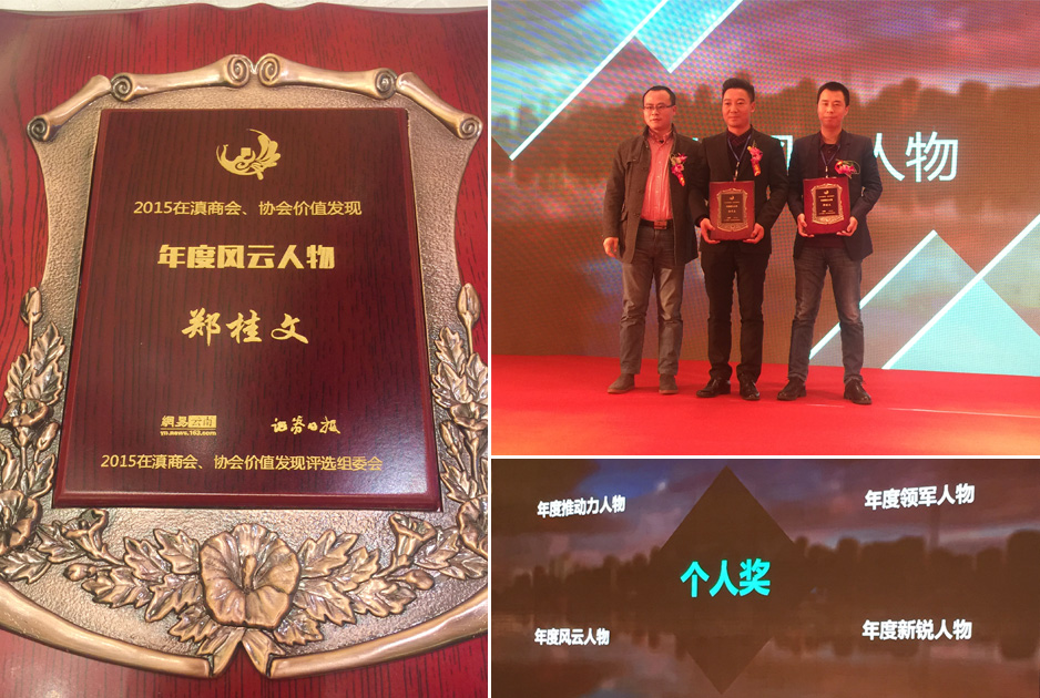 在“2015年在滇商會(huì)協(xié)會(huì)價(jià)值發(fā)現(xiàn)”活動(dòng)中,經(jīng)過(guò)在滇40余家商會(huì)、協(xié)會(huì)及專(zhuān)家組的評(píng)選,云南天度集團(tuán)董事長(zhǎng)鄭桂文榮獲“年度風(fēng)云人物”稱(chēng)號(hào)。