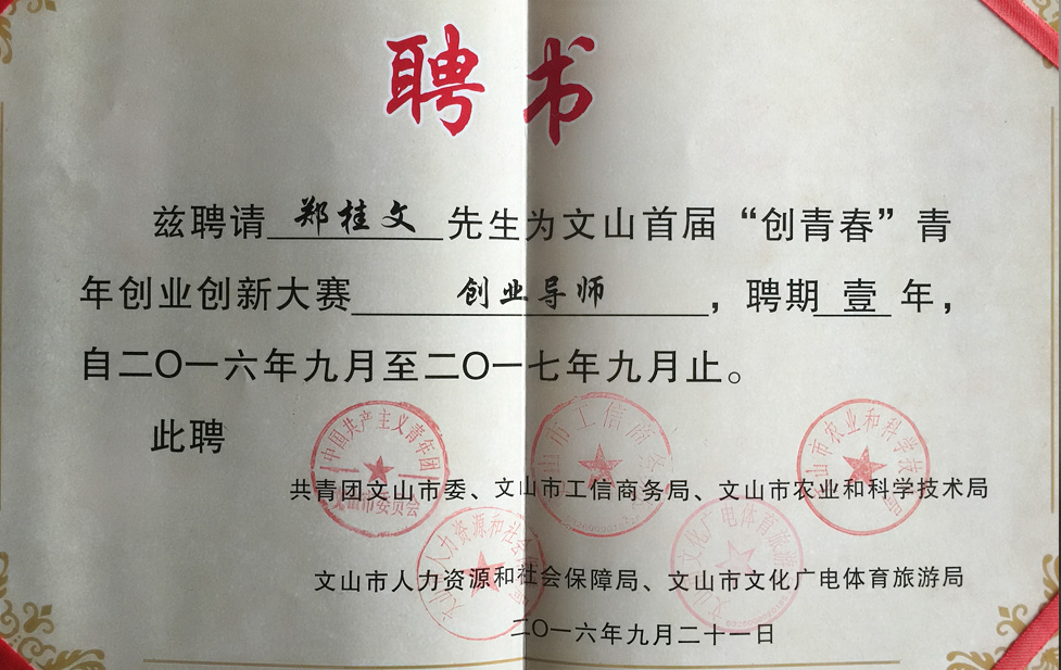 2016年9月21日10點,由文山市委副書記劉建萍同志宣布:文山市首屆‘創(chuàng)青春’青年創(chuàng)業(yè)創(chuàng)新大賽正式啟動,并為天度集團董事長鄭桂文等五位創(chuàng)業(yè)導(dǎo)師頒發(fā)了導(dǎo)師聘書。