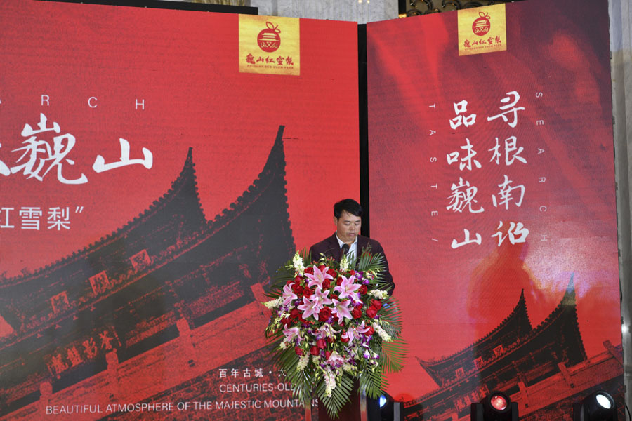 隨后,巍山縣人民政府王利偉縣長(zhǎng)、巍山縣農(nóng)業(yè)農(nóng)村局局長(zhǎng)沈看周,巍山縣馬鞍山鄉(xiāng)朝陽(yáng)合作社陳文波社長(zhǎng)分別從巍山紅雪梨的產(chǎn)業(yè)政策,種植、生產(chǎn)、加工全過(guò)程,歷史沿革及價(jià)值等方面,全方位闡述了“巍山紅雪梨”的發(fā)展前景及品牌打造的價(jià)值和意義。