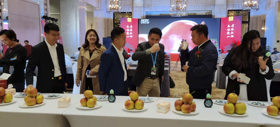 ▲施錦明向盒馬鮮生總部采購(gòu)專(zhuān)家介紹巍山紅雪梨