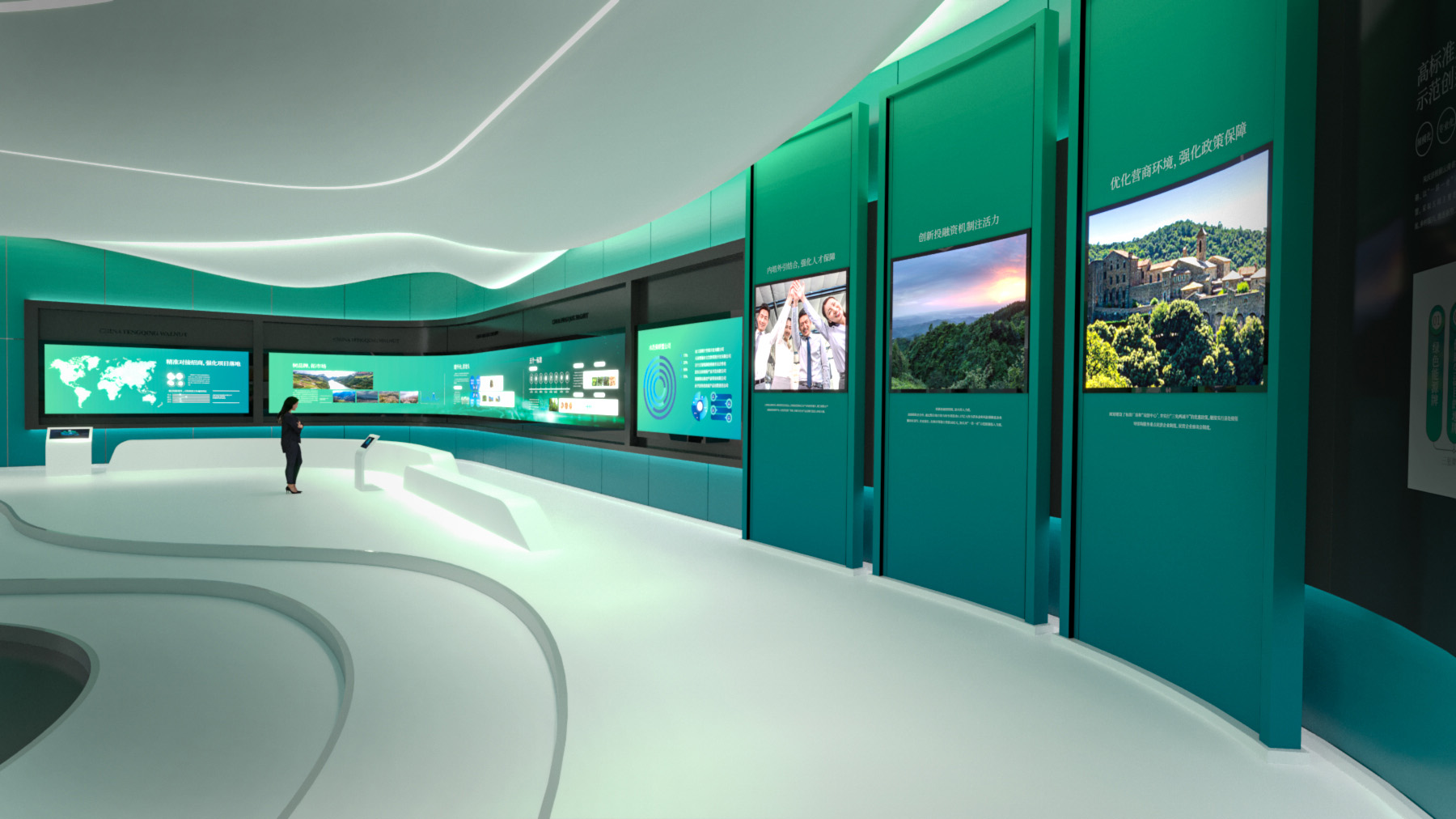 天度集團(tuán)擁有專業(yè)的展廳展館主題策劃、內(nèi)容制作、硬件集成、場館設(shè)計及施工團(tuán)隊,以多媒體和數(shù)字化技術(shù)作為展示技術(shù)、最新的影視動畫技術(shù),結(jié)合獨(dú)到的圖形數(shù)字和多媒體技術(shù),實現(xiàn)人機(jī)交互方式的展廳形式,集各種多媒體展覽展示系統(tǒng)為一體的綜合展示平臺,包括數(shù)字沙盤、環(huán)幕/弧幕/球幕影廳、迎賓地幕系統(tǒng)、互動吧臺、虛擬漫游、LED拼接屏、互動鏡面及觸摸屏等實現(xiàn)數(shù)字化展廳一站式解決、實施方案。
