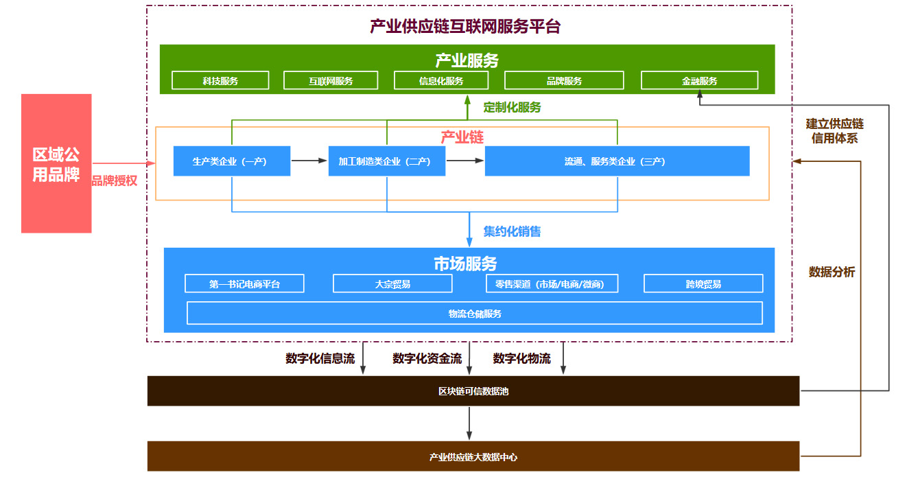 數(shù)字化供應(yīng)鏈服務(wù)平臺(tái)應(yīng)立足區(qū)域傳統(tǒng)產(chǎn)業(yè)、優(yōu)勢(shì)產(chǎn)業(yè)及重點(diǎn)支柱產(chǎn)業(yè),將電子商務(wù)將與發(fā)展需求充分結(jié)合,建立線上線下一體化的服務(wù)體系。平臺(tái)將區(qū)域品牌化體系建設(shè)為產(chǎn)業(yè)標(biāo)準(zhǔn)入口,服務(wù)于供應(yīng)鏈內(nèi)各企業(yè)主體,貫穿產(chǎn)業(yè)鏈從生產(chǎn)端、加工制造端、流通端全鏈條,以提升供應(yīng)鏈各主體協(xié)同效率。同時(shí),平臺(tái)以數(shù)字化為核心手段及時(shí)獲取供應(yīng)鏈信息流、物流、資金流等數(shù)據(jù),并基于區(qū)塊鏈技術(shù)建立一套產(chǎn)業(yè)可信數(shù)據(jù)池,應(yīng)用大數(shù)據(jù)分析技術(shù)對(duì)供應(yīng)鏈進(jìn)行動(dòng)態(tài)分析,最終實(shí)現(xiàn)智慧化供應(yīng)鏈系統(tǒng),成為基于數(shù)字化供應(yīng)鏈的集約化、智能化、創(chuàng)新性的開放式產(chǎn)業(yè)生態(tài)平臺(tái),以市場(chǎng)化、數(shù)據(jù)化、智慧化的運(yùn)營方式促進(jìn)產(chǎn)業(yè)升級(jí),創(chuàng)造價(jià)值與財(cái)富。