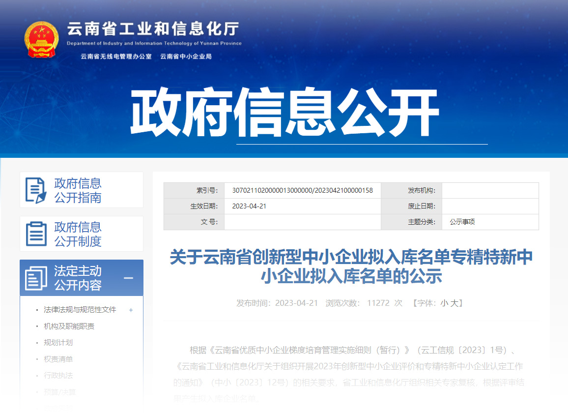 根據(jù)《云南省優(yōu)質(zhì)中小企業(yè)梯度培育管理實施細則(暫行)》(云工信規(guī)〔2023〕1號)、《云南省工業(yè)和信息化廳關(guān)于組織開展2023年創(chuàng)新型中小企業(yè)評價和專精特新中小企業(yè)認定工作的通知》(中小〔2023〕12號)的相關(guān)要求,經(jīng)省工業(yè)和信息化廳組織相關(guān)專家復核,天度集團旗下云南天度軟件系統(tǒng)有限公司入選2023年云南省專精特新中小企業(yè)、云南省創(chuàng)新型中小企業(yè)名單;云南蔚嵐信息技術(shù)有限公司入選2023年云南省創(chuàng)新型中小企業(yè)名單。