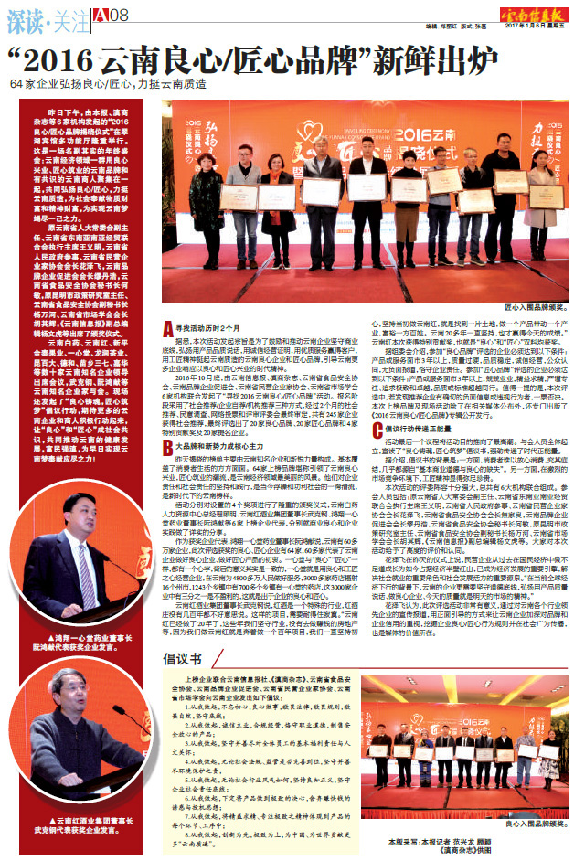 昨日下午,由云南信息報(bào)、滇商雜志、云南省民營企業(yè)家協(xié)會、云南省食品協(xié)會等6家機(jī)構(gòu)發(fā)起的“2016良心/匠心品牌揭曉儀式”在翠湖賓館多功能廳隆重舉行。這是一場名副其實(shí)的年終盛會:云南經(jīng)濟(jì)領(lǐng)域一群用良心興業(yè)、匠心筑業(yè)的云南品牌和有共識的云南商人聚集在一起,共同弘揚(yáng)良心/匠心,力挺云南質(zhì)造,為社會奉獻(xiàn)物質(zhì)財(cái)富和精神財(cái)富,為實(shí)現(xiàn)云南夢竭盡一己之力。